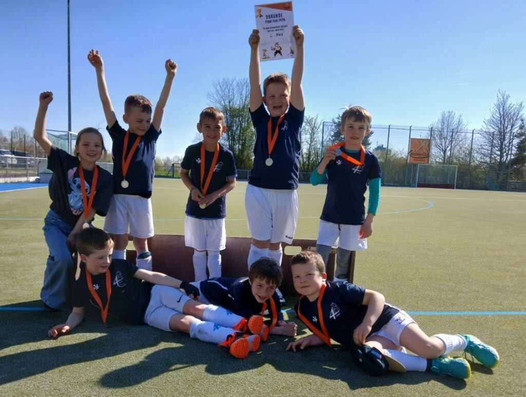 In aller früh machten sich die Jungs der m U 8 am Samstag auf den Weg nach Schweinfurt, um an einem Vorbereitungsturnier teilzunehmen. Das war zugleich die beste Möglichkeit, die Neuen, die gerade erst aus den Minis dazugestoßen sind, herzlich willkommen zu heißen. Schließlich haben die Jungs in dieser Konstellation noch nie zusammengespielt. Das merkte man auch im ersten Spiel gegen den späteren Turniersieger CaM, das zum Ende hin ein wenig zu hoch mit 1:4 verlorenging. Danach spielten die Schwabacher aber immer besser zusammen, steigerten sich von Spiel zu Spiel und sollten in den restlichen fünf Partien noch fünf Siege einfahren. Zunächst reichte es gegen TBE zu einem souveränen 3:1, bevor die männliche U 8 des Gastgebers sehr deutlich besiegt werden konnte. Da im weiblichen Bereich nach und nach alle Mannschaften abgesagt hatten, spielten die Schweinfurter Mädchen schließlich bei den Jungen mit. Dieses Spiel war noch einseitiger als das gegen die Jungs des HCS. Besonders erfreulich dabei, dass sich auch unsere Jüngsten gleich beim ersten U 8 Turnier in die Torschützenliste eintragen konnten. Aufgrund weiterer kurzfristiger Absagen spielten die ersten Drei der Tabelle am Nachmittag in den Platzierungsspielen erneut gegeneinander. Dabei konnten die Schwabacher zunächst erfolgreich Revanche gegen den CaM nehmen und nach zwischenzeitlich deutlicher Führung knapp mit 5:4 gewinnen. Zum Abschluss reichten die Kräfte trotz stundenlangen Fußballspielens zwischen den Hockeypartien noch für ein überzeugendes 5:1 gegen TBE (oder lag es am kurzfristig organisierten Motivationseis?). Damit landeten die Schwabacher Jungs in der Endabrechnung hauchdünn hinter dem punktgleichen Turniersieger auf dem hervorragenden zweiten Platz. Da die meisten immer noch nicht genug hatten, wurde anschließend das Schweinfurter Hockeygelände unsicher gemacht, was den zahlreich mitgereisten Eltern noch die Möglichkeit gab, den herrlichen Sonnenschein auf der Terrasse der Vereinsgaststätte zu genießen – insgesamt also ein toller Saisonstart in allen Bereichen.